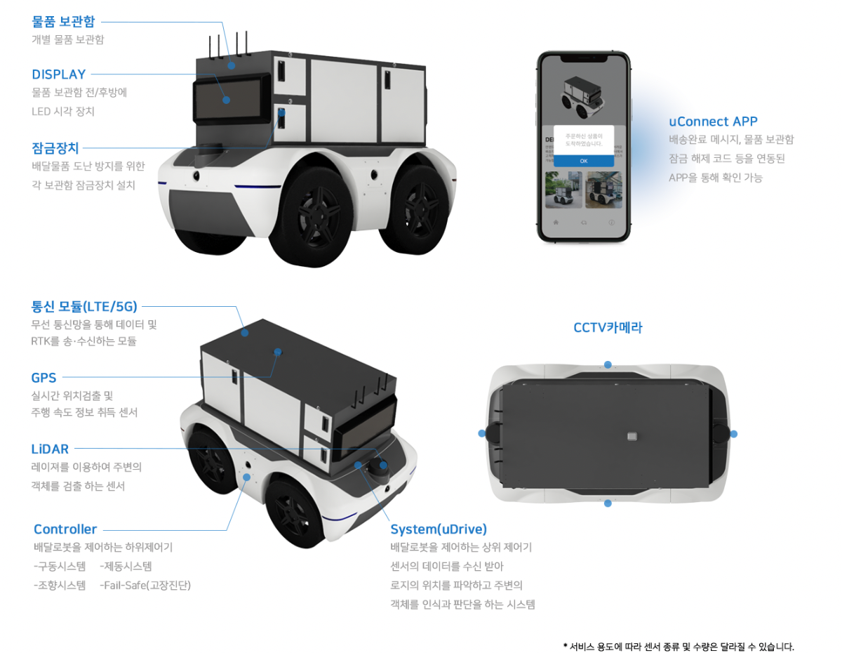 탑재된 LiDAR, Camera, GPS 등의 센서를 이용하여 배달 로봇 주위의 물체 인지 및 경로 주행, 위험 감지, 운행 통제가 가능합니다 (uDrive 1.4.1.x)