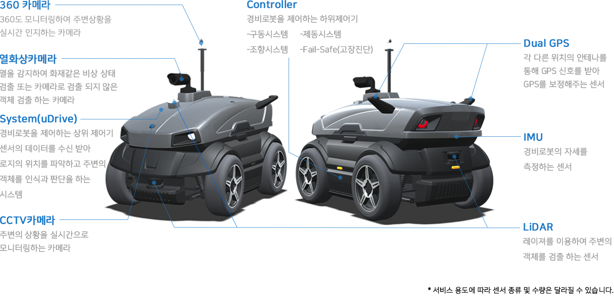 탑재된 라이다(LiDAR), 카메라, Dual GPS 등의 센서를 이용하여 거동 수상자 감시 및 경계, CCTV 사각지대 순찰이 가능하며 경비로봇의 센서 및 상태 데이터, 위치정보 등을 관제센터로 송출하여 경비, 상시 순찰 보안이 필요한 현장에서 활용될 수 있습니다.